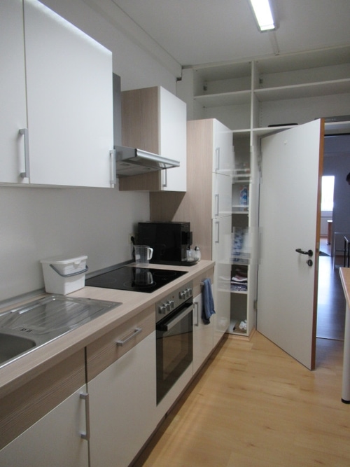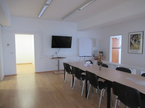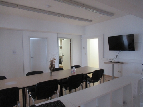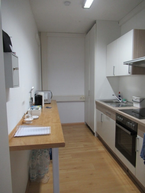 Neben dem EDV-Raum ist eine kleine Teeküche gelegen, in der Sie und Ihre Mitarbeiter sich zwischendurch eine Erfrischung oder einen Kaffee zubereiten können. Ein Kühlschrank, ein Herd mit Cerankochfeld und ein Backofen sind des Weiteren vorhanden.