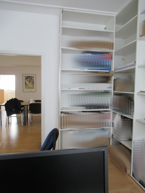 Der Serverschrank sowie der offene Einbauschrank mit Regalböden gehört zum Inventar.