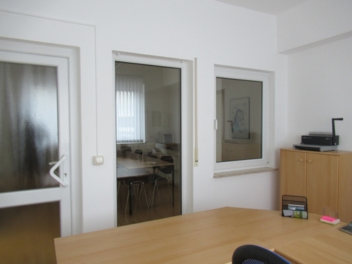 Von hier gehen Sie in einen ca. 35 m² großen, komfortablen Raum mit zentraler Zugangsmöglichkeit in die weiteren 4 Bürozimmer, die Teeküche, den EDV-Raum/Archiv sowie dem Flur/Durchgang zum Sanitärbereich mit Waschtisch, Damen- und Herren-WC.