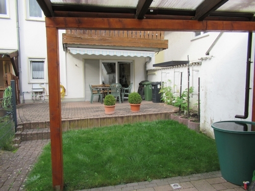 Vom Wohnzimmer gehen Sie durch eine doppelflügelige Balkontür auf die große Sonnenterrasse (ca. 20 m²). Zwei Stufen leiten Sie auf die kleine Rasenfläche bis hin zum überdachten Freisitz. Der überdachte Freisitz hat mehrere, im Boden eingelassene, Beleuchtungsspots für ein gemütliches Ambiente.