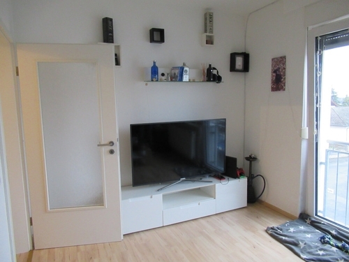 Dem Wohnungseingang genau gegenüber befindet sich das Wohnzimmer mit einer Balkontür (sog. französicher Balkon) und einem doppelflügeligen Fenster.