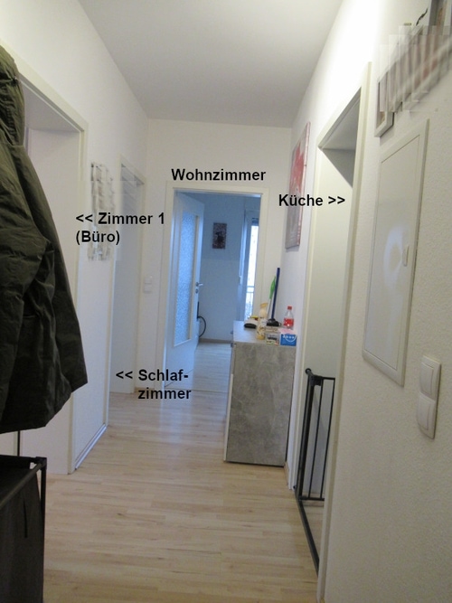 Das nächste Zimmer ist das Zimmer Nr. 1 (sh. Grundriss) mit einer Größe von ca. 9,5 m². Dieser Raum bietet sich, da der Küche gegenüber liegend, bestens als Esszimmer an.