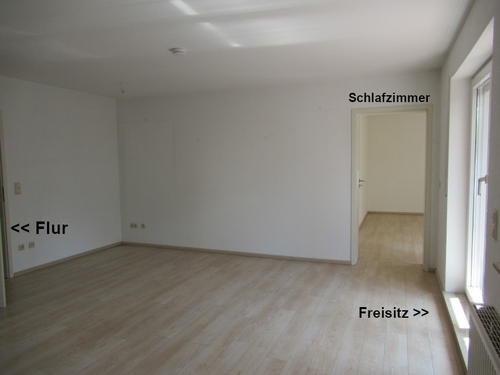 Geradeaus gehend kommen Sie in das Badezimmer und zur linken Seite in das großzügige Wohnzimmer (fast 23 m² groß) mit Zugang in die Küche, das Schlafzimmer und auf den Freisitz.