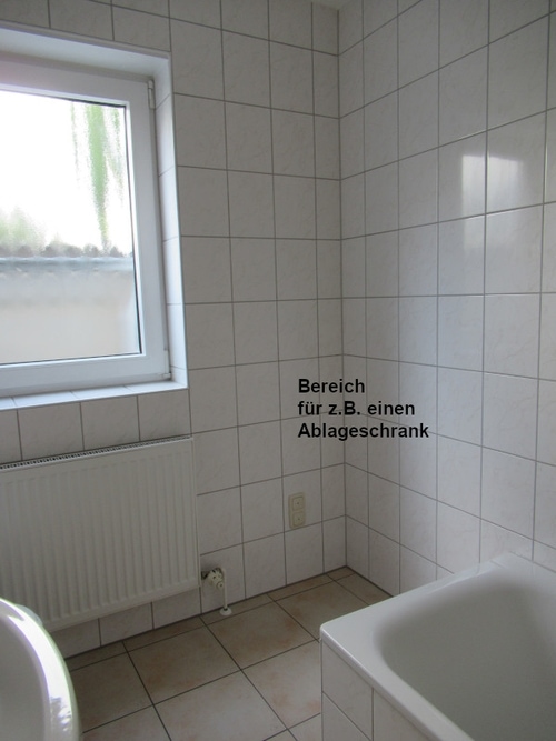 Hinter der Badewanne ist ein Platz, den Sie mit einem hübschen Ablageregal oder Schränkchen füllen können.