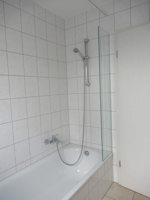 Das hübsche Tageslichtbad bietet Ihnen, neben den üblichen Sanitäreinrichtungen, eine Badewanne, eine an der Decke verlaufende Schiene für Ihren Duschvorhang sowie einen Echtglas-Spritzschutz am Rande der Badewanne.
