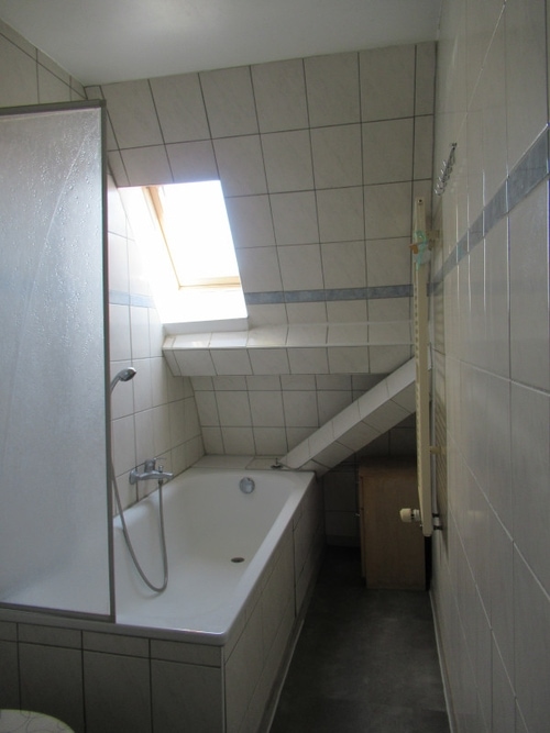 Der nächste Raum ist das Badezimmer. Es ist mit einer Toilette, einer Badewanne mit aufgesetzter Duschabtrennung sowie Badmöbel mit integriertem Waschtisch und einem darüber befindlichen Spiegel ausgestattet.