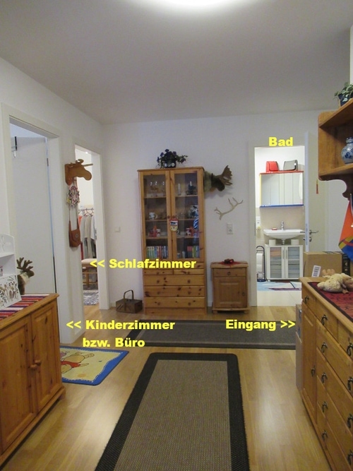 Die Wandlänge von ca. 5,50 m bietet ausreichenden Platz für einen langen Schrank oder für Regale.