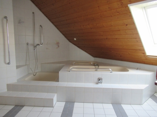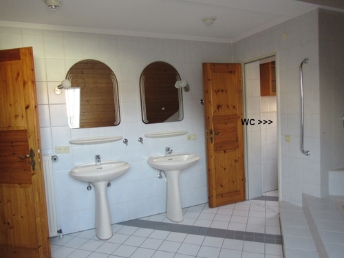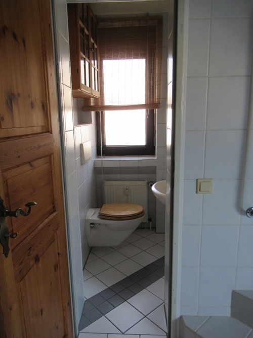 Dort finden Sie das Badezimmer mit Dusche, Badewanne, einer weiteren kleinen Wanne, Doppelwaschbecken, separatem Raum für die Toilette sowie einen Abstellraum. Das Ganze auf großzügigen, fast 13 m², Wohnfläche (Bodenfläche sogar fast 17 m²).