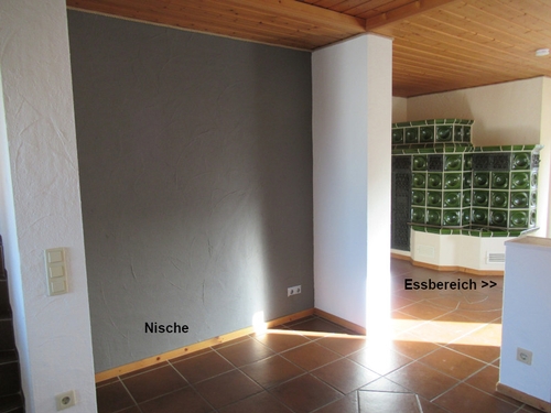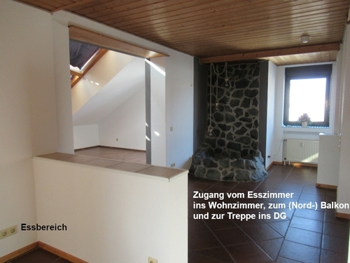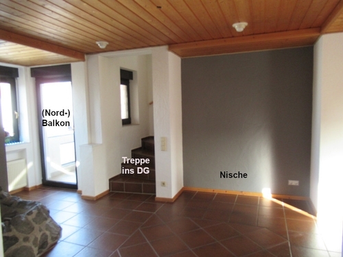 Zur rechten Seite der Sitzfläche im Essbereich aus, getrennt durch eine niedrige Mauer, geht man Richtung Wohnzimmer, auf den zweiten Balkon (Nordausrichtung) oder die Treppe hinauf ins Dachgeschoss.