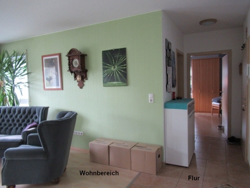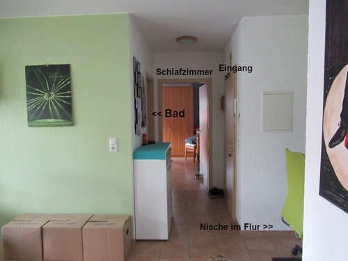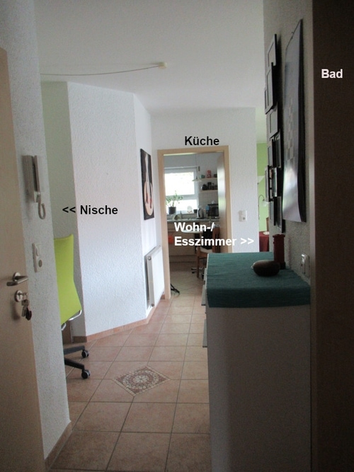 Auf dem kurzen Weg Richtung Wohn-/Esszimmer ist eine Nische eingelassen, die sich als Garderobe oder auch, wie derzeit genutzt, als Stellplatz für Ihren Schreibtisch anbietet.