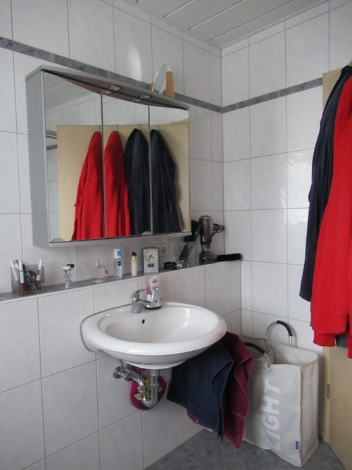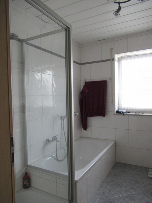 Das Badezimmer ist mit einer Echtglas-Duschkabine sowie einer Badewanne ausgestattet. Auch das Badezimmerzubehör (z. B. Handtuchhalter, Spiegelschrank usw.) gehört dazu.