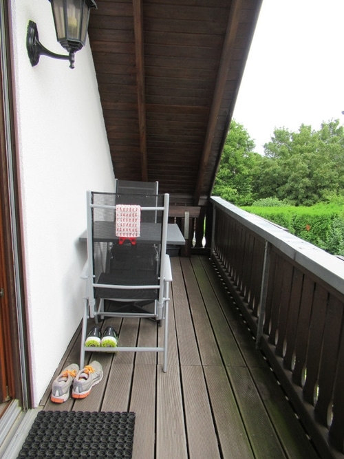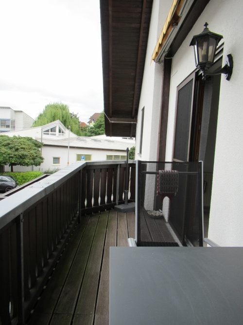Neben der vorerwähnten Regalwand befindet sich die doppelflügelige Balkontür, die auf den teilweise überdachten Süd-Balkon führt. Als Sonnenschutz ist eine elektrische Markise montiert und als Schutz des Wohnraumes vor Insekten eine Fliegengitterschiebetür angebracht. Hier können Sie relaxen und sich Ihre Pflanzen, die Sie in den bereits vorhandenen Blumenkästen arrangiert haben, ansehen.