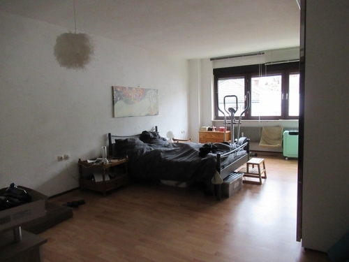 Weiter geht es in den nächsten Raum, dem Schlafzimmer. Dieses Zimmer ist mit Laminat ausgelegt und mittels großer Fensterfläche schön hell.