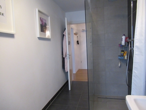 Die im Bad eingelassene Nische zwischen Zimmertür und Dusche bietet Platz für Ihre Waschmaschine und etwas zusätzlichen Stauraum.