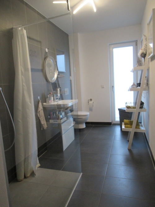 Wie zuvor erwähnt gelangen Sie von der Diele auch in das Badezimmer. Ein Traumbad !!! Große, ebenerdige Dusche mit Echtglasduschkabine, Sanitärartikel in modernem Design, Tageslicht durch ein bodentiefes Fenster und geschmackvolle Fliesen bieten Ihnen einen tollen Anblick. Sie werden begeistert sein!